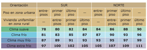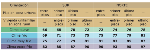 Una estimación comparativa nos acerca un paso a la demanda, por valores calculados o medidos en situaciones comparables. Suele hacerse para la totalidad del espacio, por ejemplo para una vivienda en su conjunto, teniendo en cuenta la zona climática y la ubicación (tabla 1) y hasta unas «paredes con aislamiento» (tabla 2), pero sin especificar ni el grosor ni el tipo de aislamiento. En la normativa actual ya no se usan estas tablas pero aun sirven de referencia para muchas viviendas.
