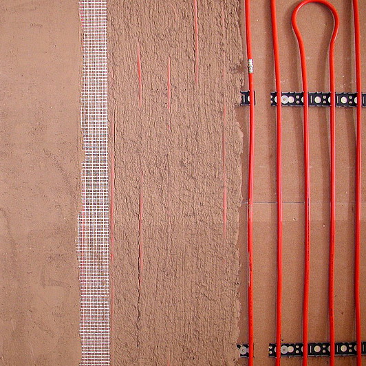El revocado de la instalación con arcilla se realiza en tres capas: 25 mm de arcilla con fibra + una malla de refuerzo + 5 mm de arcilla sin fibra.