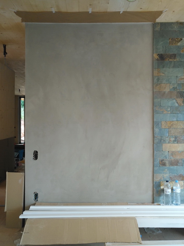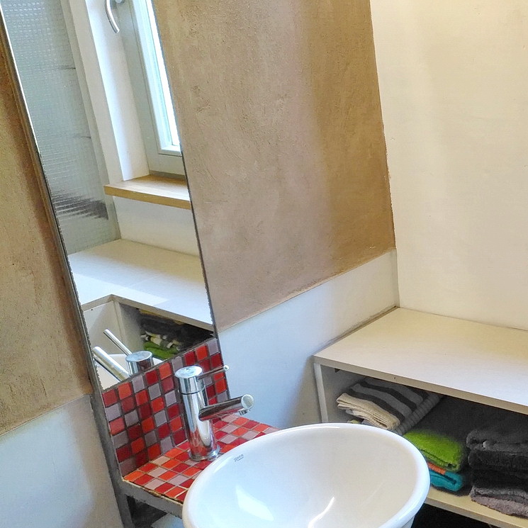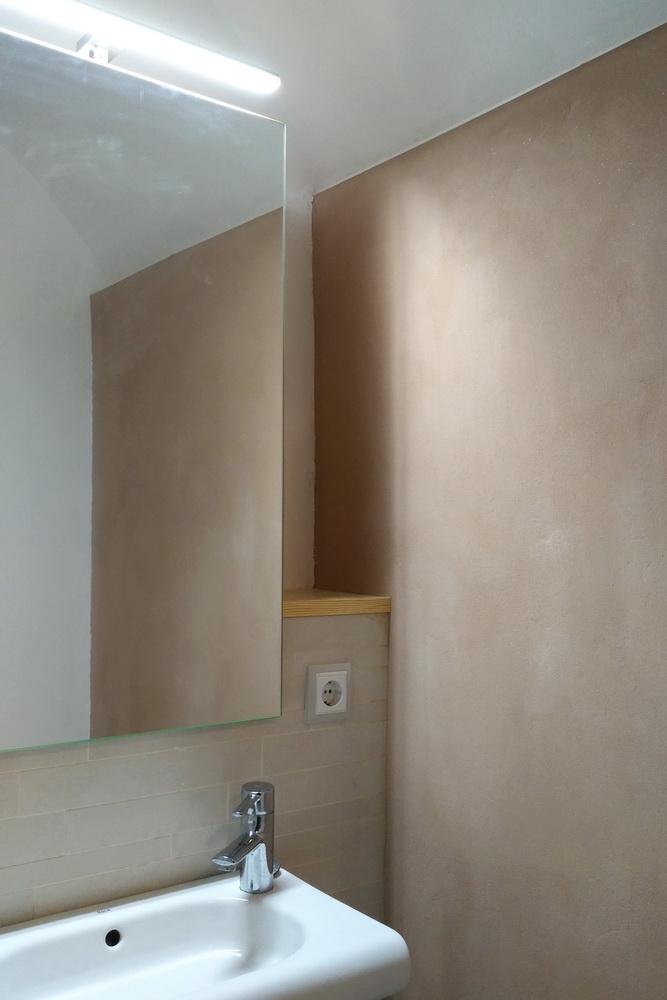 El mortero de arcilla BASE – una mezcla de arcilla natural y arenas de diferentes granulometrías – se aplica en capas de 2 a 5 mm, habitualmente sobre la arcilla BASE + FIBRA. En el caso de la pared radiante se incorpora una malla para evitar futuras fisuras. Se remolinea o alisa y puede quedar visto con su aspecto cálido y natural.