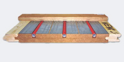 En el sistema de suelo radiante WEM se montan el tubo multicapa y los paneles aislantes de fibra de madera completamente en seco. Puede acabarse directamente con parquet – fijado a los rastreles – o con una solera en seco y cerámica.